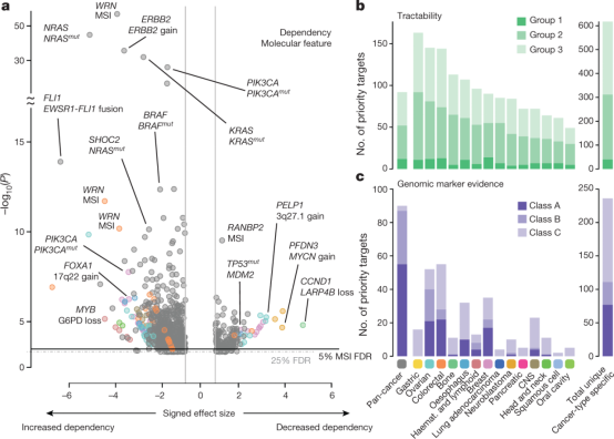 图1a展示了研究者开发的一种多种癌症类型中靶标优先选择的策略,利用Project score数据库和R包ADaM对每个相关基因分配优先级分数。
