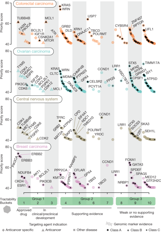 本文通过对324种人类癌细胞系进行大规模的CRISPR–Cas9基因筛选,建立了一套系统性的优先级排序框架,这为癌症治疗靶标的识别提供了新的视角。利用这套系统框架,研究人员筛选出了628个优先潜在靶标,并对它们进行了开发适用性评估,尽管这些优先靶标中包括了一些已知的抗癌药物靶点和目前正在临床或临床前开发阶段的靶点,但这项发现仍为药物甄选和再利用提供了新的方向,不仅有助于提高现有药物的开发效率,还能发现新的治疗路径。